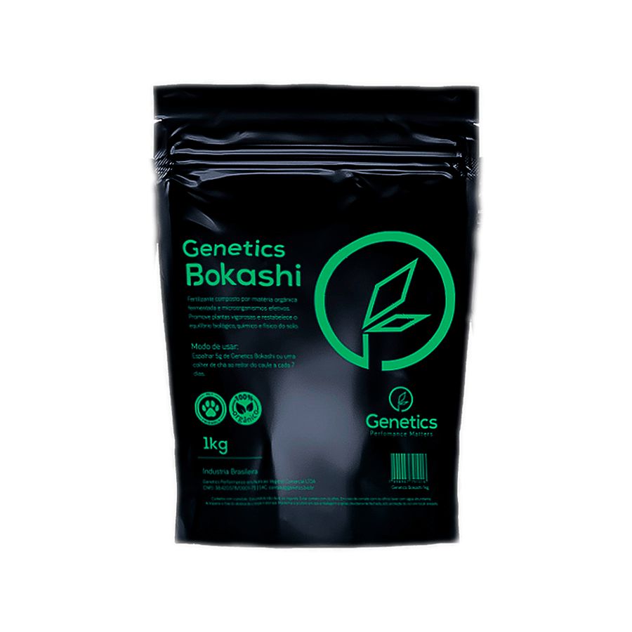 O Genetics Bokashi (tecnologia japonesa) é um fertilizante natural formado pela fermentação aeróbica de matéria orgânica misturada com turfa, substrato, farinha de osso, carvão, farelo de arroz e kefir. O processo fermentativo se inicia com a adição de microrganismos eficazes (bacillus e leveduras) e dura por volta de três meses. No processo a temperatura e umidade são controlados a fim de manter as condições ideais para o máximo enriquecimento do produto final com moléculas orgânicas e nutrientes. Tais moléculas são prontamente assimiladas pelas plantas o que resulta em um crescimento e desenvolvimento extraordinários. O Bokashi ainda atua na saúde e estrutura do solo, proporcionando o equilíbrio biológico, químico e físico que o seu cultivo precisa. Este adubo é de liberação lenta, o que significa que os nutrientes são liberados gradativamente. Por isto uma embalagem de 250g ou 1kg pode durar bastante tempo, conforme a recomendação de uso.