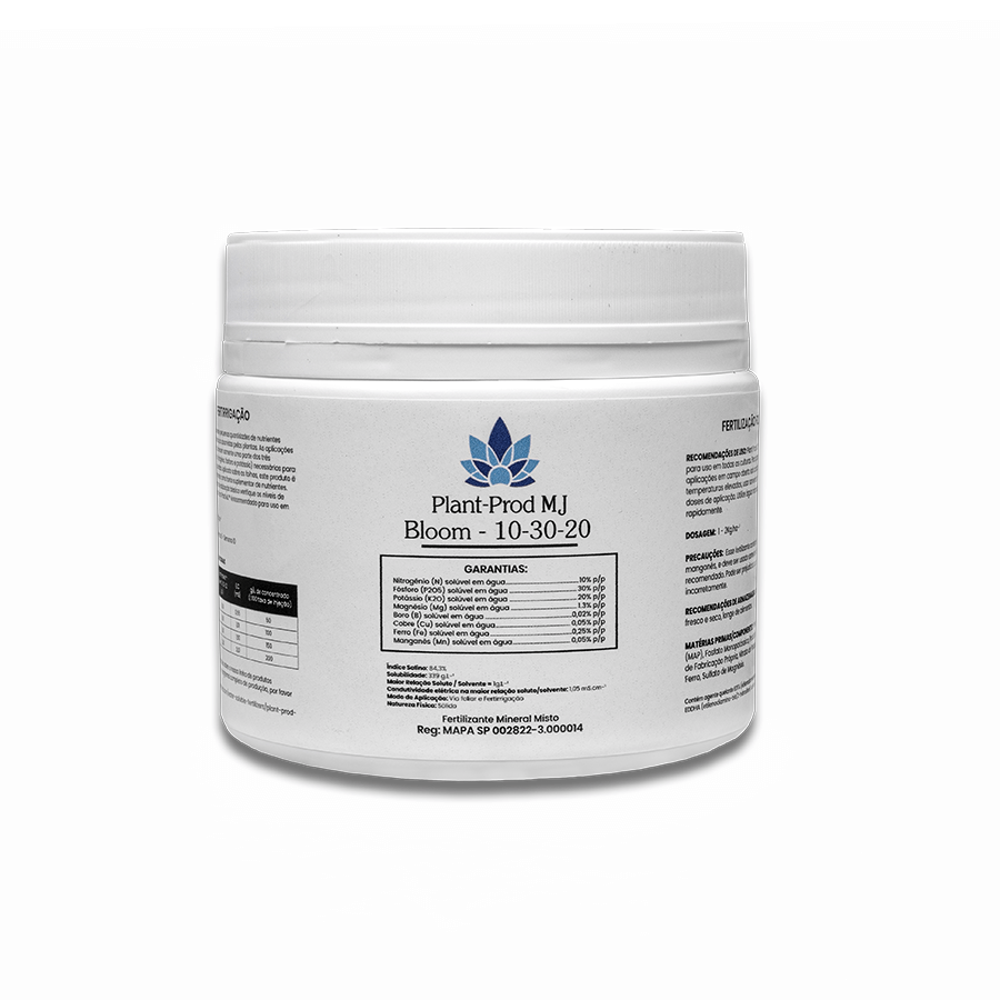 O Plant-Prod MJ Bloom 10-30-20 é uma formulação essencial para a produção de plantas medicinais. Essa formulação com alto teor de fósforo e moderado teor de potássio estimula a formação completa e melhora o preenchimento dos buds.